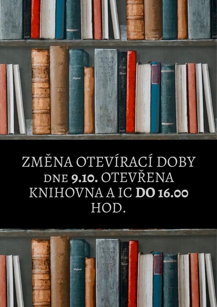 Ve čtvrtek 9.10. bude z provozních důvodů knihovna otevřena do 16.00 hod. Děkujeme za pochopení.